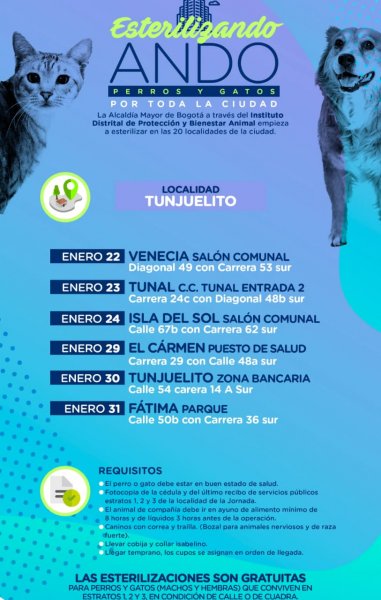 El cronograma del evento priorizará los sectores de Venecia, El Tunal, Isla del Sol, El Carmen, Tunjuelito y Fátima, en donde se realizarán las primeras atenciones a mascotas. Las fechas dispuestas se categorizarán según el sector y se ejecutarán a lo largo de dos semanas.