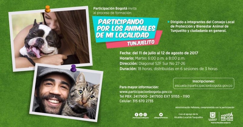 Te invitamos a participar en el proceso de formación 'Participando por los animales de mi localidad' que la alcaldia de tunjuelito estara realizando en pro de los maravillosos seres vivos que nos acompañan dia a dia.